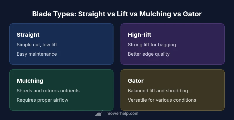 Blade type primarily changes how much lift you get, how clippings are handled, and how much nutrient return the lawn receives. Straight blades emphasize simple cuts, high-lift blades optimize bagging, mulching blades shred and return clippings, and Gator blades blend lift with mulching action.