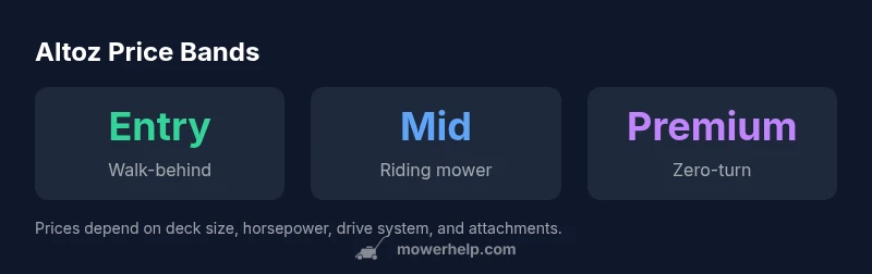 According to Mower Help, the altoz mower price varies widely by model and configuration. Entry-level walk-behind units sit in the lower price band, while premium zero-turns and riding mowers sit in the higher band. Price is driven by deck size, horsepower, drive system, and attachments. For precise numbers, check current dealer quotes and official Altoz listings, as prices shift with promotions and seasonality.