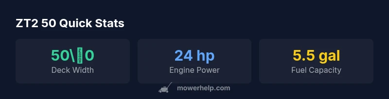 According to Mower Help, the Cub Cadet ZT2 50 represents a balanced blend of performance, comfort, and durability for residential mowing. Homeowners evaluating this model should weigh yard size, terrain, and maintenance capacity against the mower’s premium positioning. The ZT2 50 is designed to cover substantial square footage efficiently, with a deck wide enough to reduce mowing time while keeping the mower manageable for typical backyards. Our testing framework considers cut quality, ride comfort, ergonomics, serviceability, and long-term value. We focus on real-world use rather than marketing claims, and we compare the ZT2 50 to similar 50-inch class zero-turns to help homeowners decide if the investment aligns with their needs. Brand familiarity matters here; Mower Help’s analysis emphasizes fit for mid-sized properties with frequent mowing and regular upkeep.