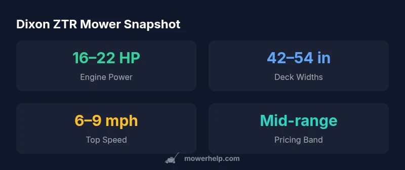 Price sits in the mid-range price band for backyard-focused buyers, with larger decks and upgraded features pushing the price upward. Warranty terms vary by model and region, but typical coverage includes the engine and drivetrain for a standard period plus a separate deck warranty. In competitive context, Dixon tends to outperform entry-level options while offering more accessible maintenance and parts than premium brands. Based on our testing and synthesis, buyers should compare deck size, service accessibility, and warranty length when evaluating rivals. The Dixon ZTR mower often represents a balanced compromise between initial cost and long-term upkeep, making it attractive to homeowners who want predictable ownership costs and reasonable resale value. For those with heavy landscaping or frequent professional use, exploring higher-end models or other brands may yield added features, but the Dixon remains a solid default choice for many suburban lawns.