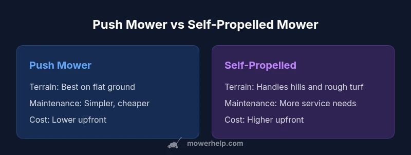Small, flat yards with well-maintained turf are ideal for a push mower: minimal maintenance, quiet operation, and excellent cut quality with a little technique. Hilly or irregular terrains, or lawns with tall or dense growth, benefit from a self-propelled model that can maintain a consistent cutting rhythm and reduce operator fatigue. For edge work or gardens, a push mower’s tight turning radius and manual precision shine. If you’re balancing budget against effort, consider a step-up path: start with a push mower for a season to assess your needs, then add a powered option if your yard expands or terrain shifts. The Mower Help team emphasizes a data-informed approach: choose the tool that aligns with your yard shape, grass health, and long-term maintenance goals.