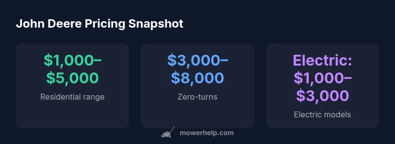 Prices vary by model and features, but residential John Deere mowers commonly fall within a broad band from the low thousands up to several thousand dollars. Look for bundles that include attachments and consider total ownership costs.