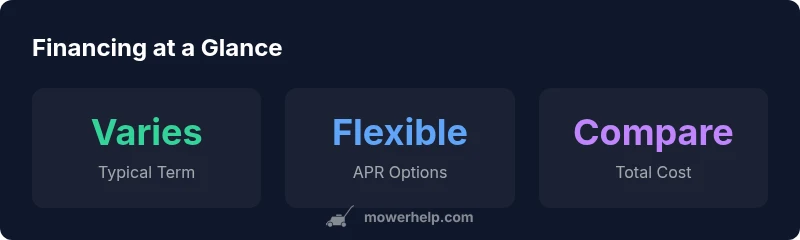 Financing a lawn mower isn't merely about the sticker price—it reshapes how you manage cash flow, maintenance budgeting, and seasonal readiness. In practical terms, lawn mower finance lets you spread the cost over several payments, reducing the immediate hit to your wallet. Yet the longer you finance, the more interest and fees you may pay, which can exceed the mower's upfront price. According to Mower Help, the right use of financing depends on cash flow, timing, and ownership horizon. Our team finds that many homeowners underestimate total ownership cost when they focus only on monthly payments. Promo APRs, prepayment penalties, and bundled service plans all influence the real cost. By reframing the purchase as a long-term asset decision—considering durability, maintenance, and expected usage—you can decide if financing is truly advantageous for your budget and lawn care goals.