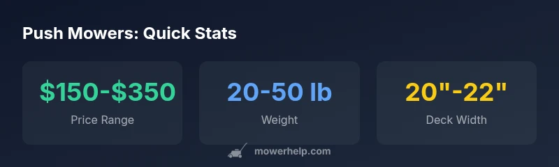 According to Mower Help analyses, push mowers for sale generally cost between $150 and $350, with deck width and power type driving the spread. Electric models tend to be cheaper than gas-powered ones, while higher-end options add features like mulching, bagging, and precise height control. For small to medium lawns, push mowers deliver dependable performance and long-term value.