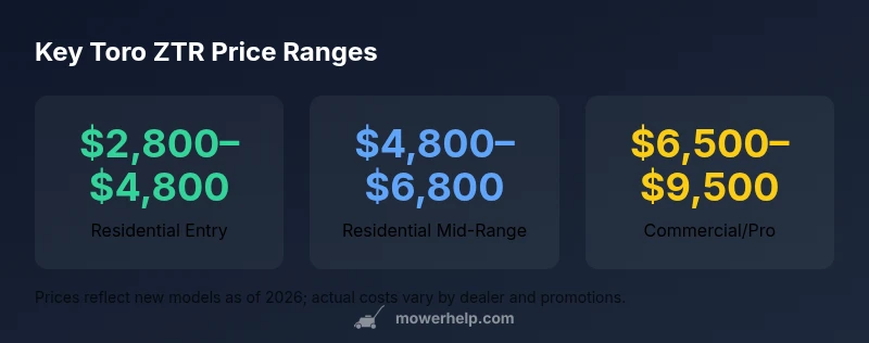 When you assess toro zero turn prices, balance upfront cost with ongoing ownership expenses, model suitability for your yard, and the dealer’s service network. The most cost-effective choice is the model that delivers reliable cutting performance, low maintenance downtime, and a robust resale market. The Mower Help Team's verdict is that informed buyers who plan for total ownership costs tend to secure the best overall value, even if the upfront price is higher than perceived bargains.