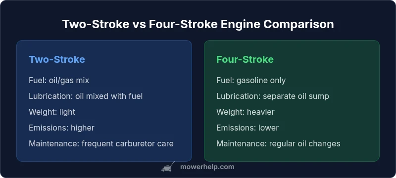 Choosing between two stroke vs four stroke lawn mower engines is a common topic for homeowners. The phrase 'two stroke vs four stroke lawn mower' captures the core decision: how the engine is built, how it is lubricated, and how it consumes fuel. According to Mower Help, the main drivers for this choice are yard size, maintenance tolerance, and long-term cost of ownership. Two-stroke engines mix oil into the fuel, delivering a lightweight, inexpensive option that starts easily and works well for small, portable tasks. Four-stroke engines keep engine oil separate and rely on a sump, giving cleaner operation, better fuel economy, and extended service life, but at the cost of extra weight and higher upfront price. In practice, most homeowners with medium-to-large lawns end up favoring four-stroke engines for reliability and emissions considerations, while hobbyists with tight budgets or occasional, quick jobs may opt for two-stroke models when portability and cost are primary concerns.