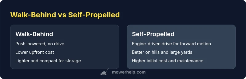 Walk-behind suits small, flat yards on a budget; self-propelled wins for larger properties, hills, and reduced fatigue.