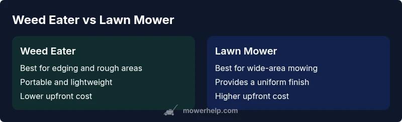According to Mower Help, weed eaters and lawn mowers are complementary tools designed for different tasks in lawn care. A weed eater (string trimmer) excels at edging, trimming around obstacles, and tackling tall weeds in irregular spaces. A lawn mower, by contrast, provides faster coverage for open areas and produces a uniform cut across larger swaths of turf. Understanding these roles helps homeowners optimize a pruning-and-mowing workflow and decide whether to buy one device, two separate tools, or a versatile multi-function model. The term weed eater lawn mower sometimes appears in marketing, but dedicated devices generally perform better for specific tasks. For most properties, a thoughtful combination—rather than a single tool—delivers the best overall results.