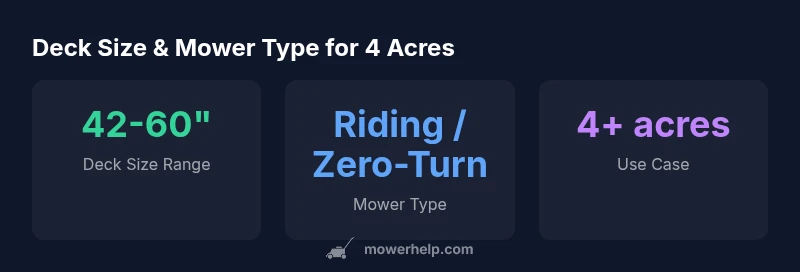 For four acres, start with a 46 to 54 inch deck on a rider; if you have hills or tight edges, go with 42 to 46 inches for better control.