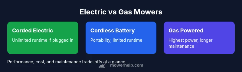 Electric lawn mowers use electric motors powered by a cord or a rechargeable battery to drive the cutting blade. They differ from gas mowers in energy source, emissions, and maintenance. The phrase electric lawn mower pros and cons captures the essence of what buyers weigh before purchasing. For many homeowners, the benefits are clear: simple starting, quiet operation, and lower ongoing maintenance. Modern models also offer mulching or bagging capabilities and adjustable deck heights to handle different grass conditions. On the other hand, the downsides include dependence on a power outlet or a charged battery, potential range limitations for large yards, and sometimes less raw cutting power on thick or tall grass. The decision often hinges on yard size, storage space, and how you mow: how often, how fast, and under what weather. The Mower Help team notes that even with rapid improvements in battery technology, the core trade-off remains convenience versus uninterrupted power during longer sessions. If you own a small city plot, an electric mower is typically a great fit.