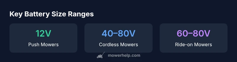 Definition: There is no single standard size for a lawn mower battery. According to Mower Help, size depends on mower type and voltage class: push mowers use smaller 12V lead-acid packs, while cordless models use higher-voltage Li-ion packs (commonly 40V–80V). Physical dimensions vary, but most packs are within a few inches in length and width, with heights around 4–7 inches.