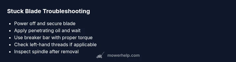 The most frequent causes of a blade that refuses to budge include a seized spindle nut, corrosion buildup on threads, bent or damaged blade holes, and misaligned or damaged retaining bolts. Corrosion can form a crust that binds the nut to the spindle, making even a strong wrench slip. A seized left-hand thread is another pitfall; some brands use reverse threads on certain blades, which is easy to misinterpret if you assume standard righty-tighty rules. Mower Help analysis shows that corrosion and seized nuts are the leading factors for stalling blade removal. If you find a left-hand thread, turn the bolt in the opposite direction from what you might expect and verify the manual for the exact spec of your model.
