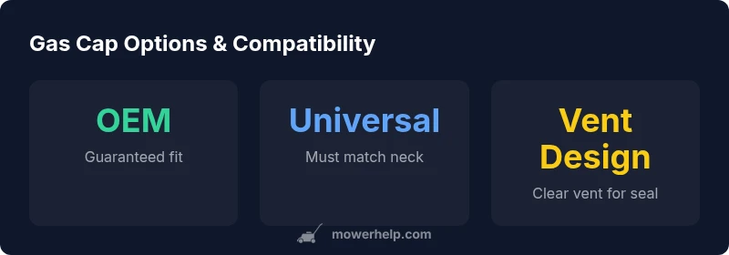 OEM vs universal caps: what to choose\n\nOEM Toro caps guarantee fit and preserve warranty terms when used as directed, but may cost more and have longer lead times. Universal caps offer broader availability and can be a good fallback if you verify thread pitch and vent compatibility, but there’s a higher risk of an improper seal or incorrect venting. Always verify the cap you select matches your model’s thread type, vent needs, and gasket size before purchasing. For many owners, starting with an OEM cap and moving to a universal option only if stock is unavailable is a balanced approach.
