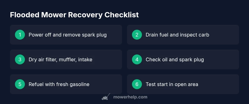 After recovery, implement preventive practices: store mowers in a dry area, use fuel stabilizers, and drain water-prone parts if storage is extended. Regular maintenance reduces flood-related risk and extends mower life. The Mower Help team recommends a seasonal checkup focusing on fuel lines, carburetor, seals, and air intake to minimize future issues. Keeping your mower dry and well-maintained is the best defense against recurrent damage.