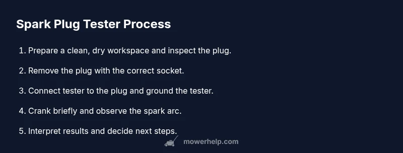 A spark plug tester is a simple tool that simulates the ignition system, allowing you to observe the spark produced by the mower's spark plug. For homeowners, this is a practical, low-cost way to diagnose ignition problems before diving into carburetor cleaning or fuel-system work. The goal is to determine if the spark is strong and consistent enough to ignite the fuel-air mixture. How to use a spark plug tester on a lawn mower becomes clear once you understand what to look for: a bright, consistent spark arc and reliable ground path. According to Mower Help, a healthy spark should jump the gap reliably and show minimal resistance across connections. This helps you distinguish ignition faults from fuel or compression problems and saves time on unnecessary repairs.