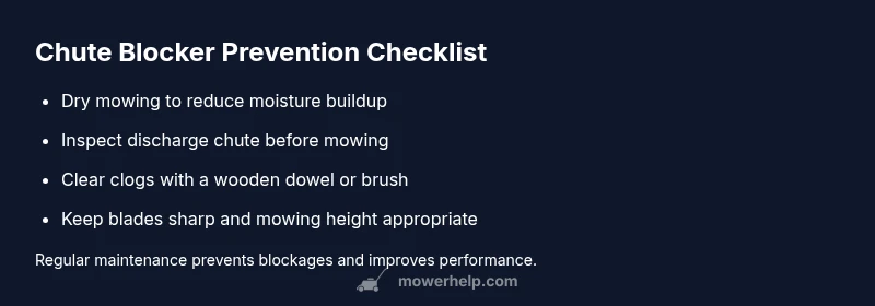 A lawn mower chute blocker is a buildup of grass, leaves, and debris that jams the discharge chute, preventing clippings from exiting cleanly. This issue commonly occurs when mowing damp or tall grass, using a mower with a dull blade, or neglecting regular upkeep. When the chute blocks, clippings can pile up under the deck, causing uneven discharge, more resistance, and, in worst cases, overheating. Regular checks during maintenance help you spot developing clogs before they become a problem. According to Mower Help, a proactive approach—cleaning the chute after sessions, keeping the blade sharp, and clearing tall clumps as you go—significantly reduces the risk of blockages. Understanding how a chute blocker forms helps you design a simple routine that keeps your mower cutting evenly and safely. By treating the chute as part of routine maintenance, homeowners can reduce downtime and repair costs. The key is to stay ahead of buildup with a simple, repeatable process that protects your mower and your lawn.