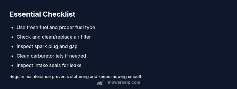 Most often, a stuttering lawn mower points to fuel delivery or air intake problems. Start with the simplest fixes: verify fresh fuel, inspect or replace a dirty air filter, and check the spark plug gap. If stuttering persists, follow the diagnostic flow for deeper causes and use the step-by-step fixes until the mower runs smoothly.