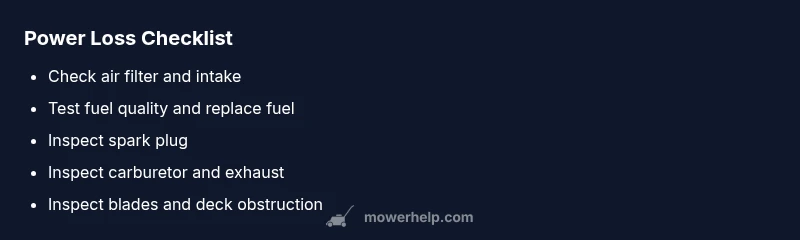 Begin with the air side and fuel quality. A dirty air filter reduces airflow, causing the engine to run lean and lose power. Check the air path for obstructions and replace a clogged filter. Next, drain stale fuel and refill with fresh gasoline, preferably from a sealed container. Old fuel can degrade carburetor jets and cause starting and power issues. If the mower has a fuel filter, inspect and replace if dirty. When fuel and air look good, inspect the fuel line connections for leaks or kinks. These checks address the most common causes of power loss and set the stage for deeper diagnosis.