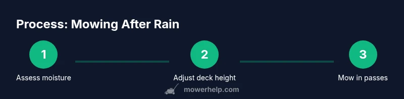 After rain, postpone mowing until the lawn is dry enough to walk comfortably and the soil is firm. Ensure the mower blade is sharp and set to a higher cut height to minimize turf stress. Wear sturdy footwear and eye protection, and plan to mulch clippings or bag as needed. This approach reduces damage to the lawn and improves mower performance.