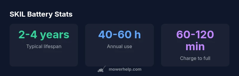 The Skil lawn mower battery typically lasts 2-4 years with proper maintenance and moderate usage, and replacement should be considered when performance drops below 50% of original run time. Look for swollen cells, rapid discharge, or hard starts as warning signs. Choose compatibility, safety, and warranty when buying a replacement battery.