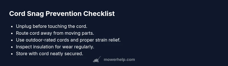 Most often the cord on a lawn mower gets snagged by the deck, blade guard, or drive cables after trimming grass. The quick fix is to unplug the mower (or remove the battery), then gently free the cord without yanking. If tangled around the blade, rotate by hand and unwind with insulated pliers. Inspect for damage before resuming.