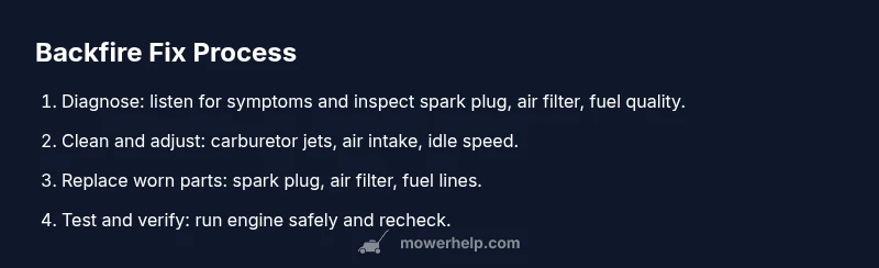 Backfiring is a loud symptom of unburned fuel igniting in the exhaust. In small engines like lawn mowers, backfires are usually caused by issues in the fuel-air mix, ignition timing, or exhaust flow. According to Mower Help, backfires are most often preventable with routine maintenance. The common culprits include a carburetor that is dirty or out of adjustment, a spark plug that is worn or fouled, a clogged air filter that restricts air, and old or ethanol-laden fuel that doesn’t burn cleanly. Other factors include starting in the wrong gear, a choke left on too long, or a hot engine that cools too slowly after a run. Temperature can exacerbate backfires, especially in engines that run lean or with an overly rich fuel mixture. Additionally, a damaged muffler or exhaust where unburned fuel collects might ignite when it reaches the hot metal. Finally, ignition timing drift or a failing kill switch can cause the spark to fire at the wrong moment, which increases the chance of backfire during startup or acceleration. Understanding these causes helps you plan a safe, systematic repair approach rather than guessing. In this guide, you’ll learn a practical, step-by-step process to identify and fix the most common culprits, with safety as the top priority. The Mower Help team emphasizes staying within safe limits and using proper tools throughout the repair.