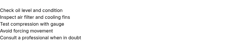 If you encounter persistent resistance after performing the above checks, or if you notice signs of mechanical damage (loud grinding, metal shavings in oil, or lost compression), stop immediately. A seized engine may require dismantling, bore evaluation, piston-ring replacement, or valve work—tasks that are not safe for most DIY setups. A professional technician can confirm the diagnosis, perform precision measurements, and quote a repair or replacement plan. Early consultation can prevent further damage and cost.
