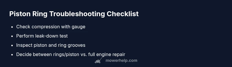 If you own a small two- or four-stroke lawn mower, the piston rings play a critical role in sealing the combustion chamber. Over time they can wear, leading to compression loss and oil burning. This guide explains how to tell if lawn mower piston rings are bad, with practical tests you can perform with common tools. According to Mower Help, the quickest way to differentiate ring wear from valve or gasket issues is to start with a compression test and observe oil and smoke behavior during operation. With patience and careful steps, you can confirm whether the rings are the root cause or if another component is at fault.
