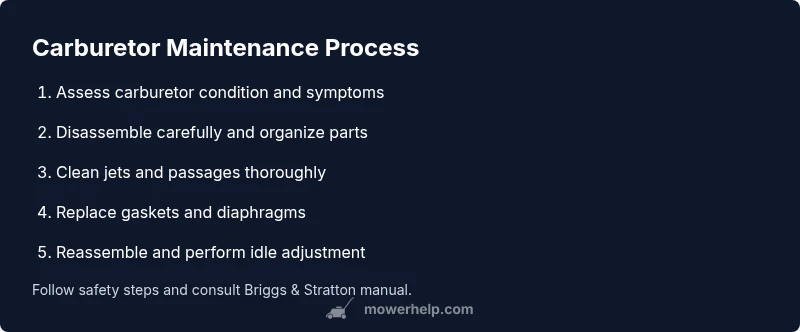 The carburetor in a Briggs and Stratton small engine is the gateway between fuel and air that powers your lawn mower. Most Briggs & Stratton engines use a diaphragm-type carburetor with a float and needle valve. When fuel flows past the inlet jet, the diaphragm moves to regulate mixture and idle speed. Over time, varnish deposits from stale fuel, dirt, or degraded gaskets can obstruct jets or the float needle, leading to hard starting, erratic idling, or stalling. In this guide, we focus on practical, homeowner-friendly steps to diagnose typical symptoms and safely restore performance. According to Mower Help, routine carburetor care minimizes wear and reduces the likelihood of expensive repairs. As you work, remember that accuracy and cleanliness are your best allies: even a small speck of debris can disrupt fuel flow. The lawn mower carburetor Briggs and Stratton is a centerpiece of fuel system reliability, so treat it with careful attention and respect for safety.