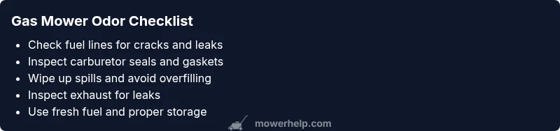 Most often, a lawn mower smells like gas due to a small fuel leak, a rich carburetor condition, or exhaust backflow. Quick fix: stop running the engine, inspect fuel lines and fittings for seepage, tighten connections, and wipe away spills. If you can't locate the leak, follow the diagnostic flow for safe troubleshooting.