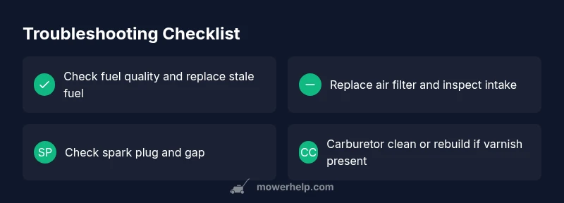 Common causes are stale fuel, a clogged air filter, dirty carburetor, or ignition issues. Start with fuel, air, and spark checks before considering carburetor work.