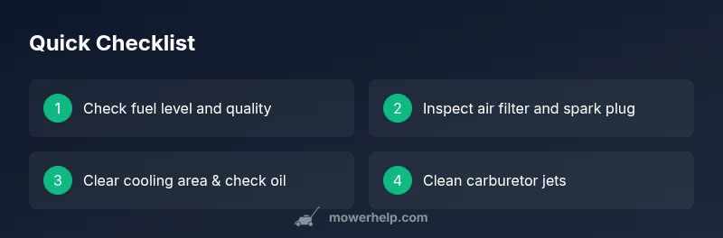 Common causes are fuel issues, dirty air filters, or overheating. Start with fuel and air checks, then cooling; seek professional help if it persists.