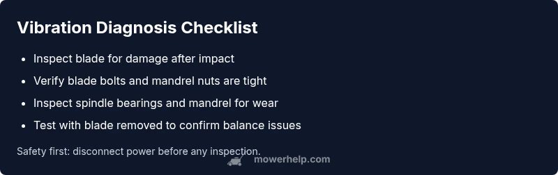 This flow helps you quickly triage: start with simple fastener checks, then blade replacement if needed, and escalate to bearings or deck repair only if the vibration persists. The goal is to safely isolate the issue while avoiding unnecessary disassembly. If you encounter unfamiliar components or see obvious structural damage, professional help is advised.