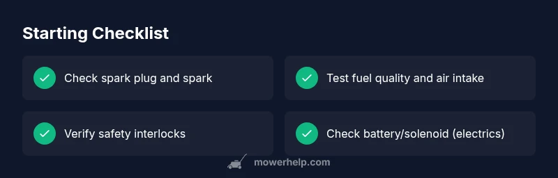 When a mower won't crank, the issue is usually one of a short list: ignition problems, fuel quality, safety interlocks, or a simple mechanical jam. According to Mower Help, you should start with the easiest checks that require no tools. The Mower Help team found that most crank failures originate from a fouled spark plug, stale fuel, or a safety switch not engaged properly. Before you tear into the engine, take a quick photo of the spark plug area and any obvious fuel leaks; this saves time if you later need professional service. This triage helps homeowners prioritize steps and avoid unnecessary disassembly. Document the mower model and last maintenance date, so you can track patterns. Remember safety: disconnect the spark plug wire from the spark plug when inspecting it, and keep hands clear of the cutting deck. In many cases, a 10-15 minute check can reveal the root cause and save a lot of frustration.