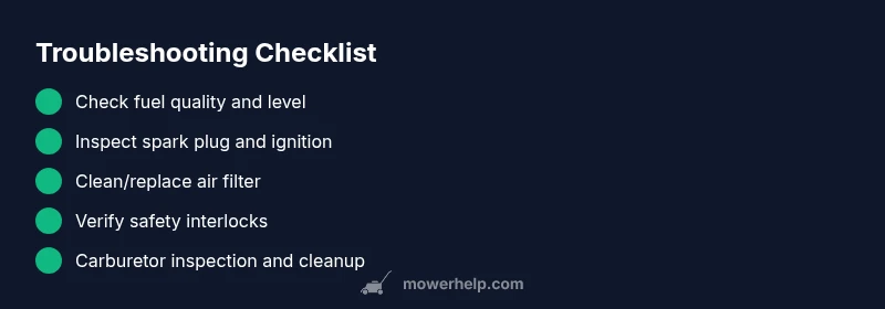 When your lawnmower won’t start, you want quick wins. The most common culprits are fuel quality, spark ignition, and safety interlocks. According to Mower Help, starting issues almost always trace back to one of these areas. In this quick-start section, you’ll learn a fast triage approach to confirm or dismiss each factor within a few minutes, so you can decide whether you can fix it on your own or need a service visit. Start with the simplest checks, then move to targeted fixes if needed. By prioritizing fuel, spark, and safety, you can often restore operation without a visit to the shop.