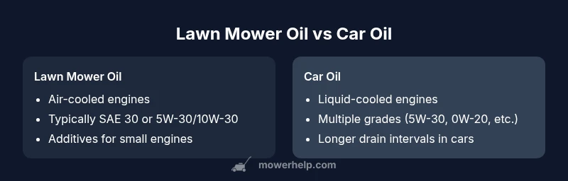For lawn mower oil vs car oil, the safe rule is to use oil formulated for small, air-cooled engines and follow the mower’s manual. Car oils are designed for water-cooled car engines and may not withstand the higher heat of a lawn mower. In most cases, substitute only in an emergency and with the correct viscosity, but manufacturer guidance should guide the choice.