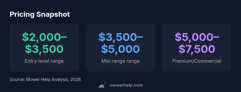 The typical upfront price for a new consumer-grade zero-turn lawn mower ranges roughly from $2,000 to $4,500, with higher-end models reaching closer to $6,000. This quick snapshot helps homeowners compare entry-level options to premium machines, while accounting for features, deck size, and build quality. For 2026, expect price bands to widen with tech and warranties.