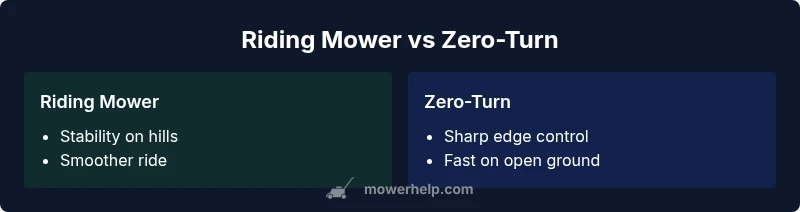According to Mower Help, the riding lawn mower and zero-turn mower are designed to solve different mowing challenges. A riding mower emphasizes stability, comfort, and efficiency on uneven terrain, long straight runs, and larger properties where a smooth ride matters. A zero-turn mower prioritizes maneuverability, edge precision, and mowing speed on flat to gently rolling lawns with obstacles. The Mower Help team emphasizes that the best choice starts with yard layout, terrain, and user preference for control style. Understanding these core design intents helps homeowners map their needs to the right class of mower.